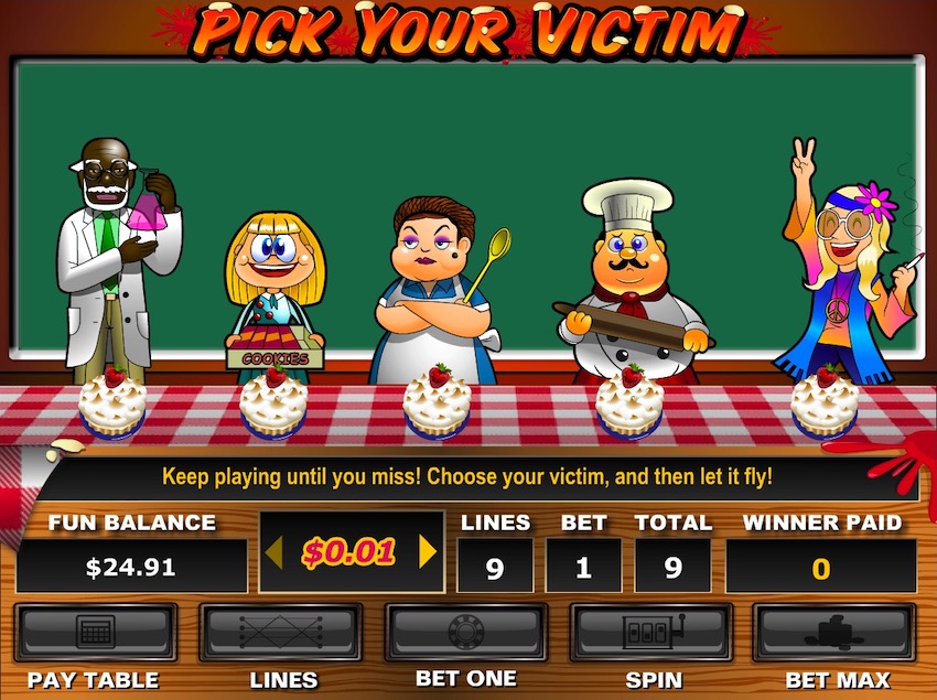 Choose your victims carefully in this round and click the pie to send it flying! With every spat of the pie, you will win an amount based on your total bet of the spin.