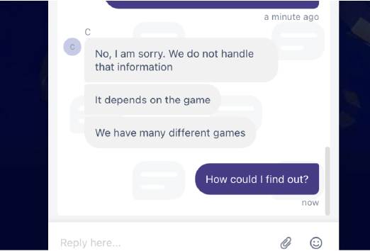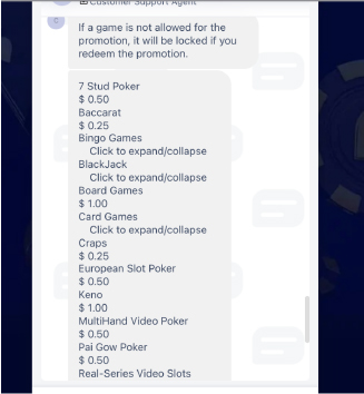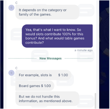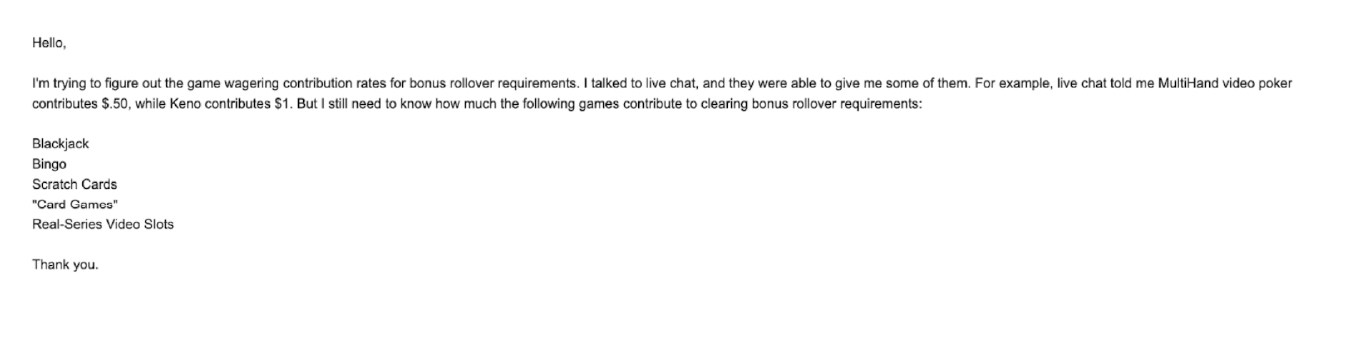 When I had a question about game contribution rates for bonus rollover requirements, they told me they didn’t have that information.
