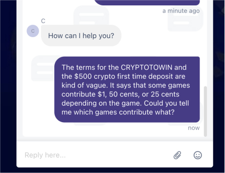 While this site offers two crypto bonuses with 25x rollover requirements, the information about them is very vague. I had to ask customer support multiple times for clarification, and they hesitated to answer my questions.